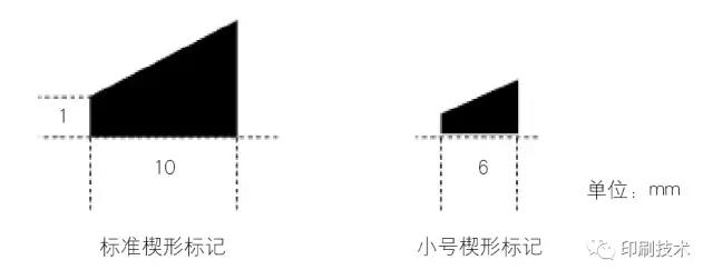 應(yīng)根據(jù)凹印機(jī)套準(zhǔn)系統(tǒng)的要求來確定,與傳統(tǒng)的卷筒紙印刷切平張方法一致,大部分使用三角標(biāo)記或著楔形標(biāo)記,以博斯特820凹印機(jī)為例,標(biāo)準(zhǔn)的楔形標(biāo)記長度10mm,楔形短端1mm,如圖1所示,小號楔形標(biāo)記長度6mm,多用于軟包煙包的套印。
