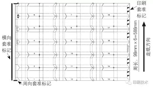 如果條件允許,每個重復(fù)周長內(nèi)周向套準(zhǔn)光標(biāo)的數(shù)量盡量與后加工燙印、模切周期一致或者成比例關(guān)系。例如,硬包小盒一般采用18聯(lián)印刷、18聯(lián)燙印、24聯(lián)或30聯(lián)模切,此時(shí)可以考慮在每橫排的空余位置做一個套準(zhǔn)光標(biāo),可供燙印和模切縱向套準(zhǔn)共同使用,這樣既可以提高后加工設(shè)備套準(zhǔn)光標(biāo)的識別能力,又可以縮短后加工設(shè)備套準(zhǔn)時(shí)間,減少材料浪費(fèi)。