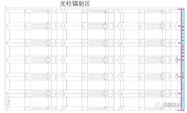 對于鐳射轉(zhuǎn)移紙,特別是光柱鐳射紙,如果套準(zhǔn)光標(biāo)直接印刷在鐳射區(qū),套準(zhǔn)光電探頭在識讀標(biāo)記時(shí)容易產(chǎn)生漫反射,信號波形不穩(wěn)定,套印波動大,一般給印刷套準(zhǔn)預(yù)留獨(dú)立的白邊或銀邊,典型的排版圖如圖3所示。