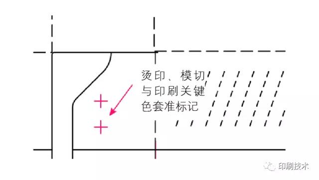 卷筒紙燙印、模切加工可能還需要其他標(biāo)記,如預(yù)留給燙印、模切與印刷關(guān)鍵色套準(zhǔn)檢查的十字標(biāo)記,如圖5所示。