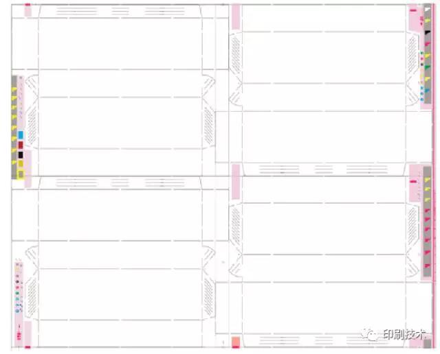 如果凹印設(shè)備的套準(zhǔn)系統(tǒng)升級困難,但印刷色組數(shù)足夠,經(jīng)過反復(fù)實(shí)驗(yàn),我們實(shí)施了一種反向套印的方法供同行參考,將所有的套準(zhǔn)光標(biāo)印刷在成品余料區(qū)域,在第一色套準(zhǔn)光標(biāo)前,印刷遮蓋力強(qiáng)的油墨墊底,如白色、銀色,將光柱的強(qiáng)反射光遮住或部分遮住,減少漫反射,使得套準(zhǔn)光電探頭讀出來的信號雜波較少,波形穩(wěn)定,這個墊底的第一色以第二色為基準(zhǔn),反向跟蹤套印,也能實(shí)現(xiàn)套準(zhǔn),同時(shí)還可以在色組間增加反向套準(zhǔn)的跟蹤監(jiān)視,從而可以去掉10~12mm的白邊或銀邊,有效節(jié)約紙張。以條盒為例,紙張幅寬由740mm減小為730mm,拼版示意圖如圖7所示。該條盒產(chǎn)品通過插拼,同時(shí)將套準(zhǔn)光標(biāo)放在插拼的余料中,紙張節(jié)約率達(dá)到1.4%。