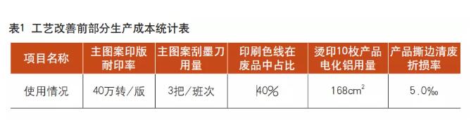 由于該產(chǎn)品印刷顏色多、生產(chǎn)工序多、紙張幅面大、套印精度要求高、油墨流平性控制難、燙印圖案方向固定、紙張表面光滑等原因,造成產(chǎn)品合格率低,印版耐印率低,電化鋁利用率低,刮墨刀更換頻繁,撕邊清廢折損率高等問題,生產(chǎn)成本居高不下?,F(xiàn)把主要工序工藝改善前的部分生產(chǎn)成本情況進行統(tǒng)計,如表1所示。