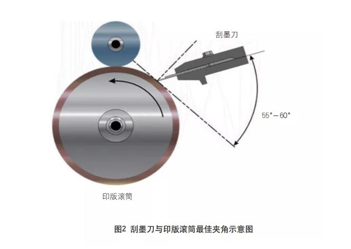 通過多次試驗驗證,確認刮墨刀與印版滾筒之間的夾角控制在55o~60o之間,刮墨刀與印版滾筒之間的壓力控制在1.5±0.1bar時效果較佳,如圖2所示。刮墨刀刮墨干凈,無明顯磨損,產(chǎn)品表面無色線。