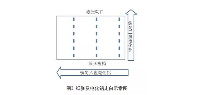 在燙印工序,改善前的電化鋁走向為縱向,如圖3所示。因為電化鋁上有“黃金葉”葉子形狀的圖案,葉子燙印圖案的方向必須與印張一致,根據(jù)印刷圖案3×6的排版方式,及電化鋁中“黃金葉”葉子的原有排列方向,電化鋁的走向需為縱向,走箔方式為勻步加跳步,使用3盤3cm寬的電化鋁。