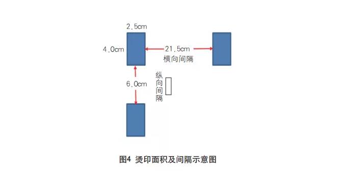 但是通過觀察測量燙印圖案面積和間隔,如圖4所示,經(jīng)過計算對比電化鋁跳步距離,發(fā)現(xiàn)電化鋁走向為縱向時浪費較大,每燙印10枚產(chǎn)品平均使用電化鋁的面積為56×3=168cm2,并且電化鋁更換頻繁,停機次數(shù)較多,每盤1200m長的電化鋁只能燙印4000張印張;而電化鋁走向改為橫向時,走箔方式為勻步,使用6盤5cm寬的電化鋁,每燙印10枚產(chǎn)品平均使用電化鋁的面積為18×5=90cm2,每盤1200m長的電化鋁能夠燙印20000張印張,不但電化鋁的使用面積減少,停機次數(shù)也大為減少,生產(chǎn)效率明顯提高,產(chǎn)品質量也更加穩(wěn)定。