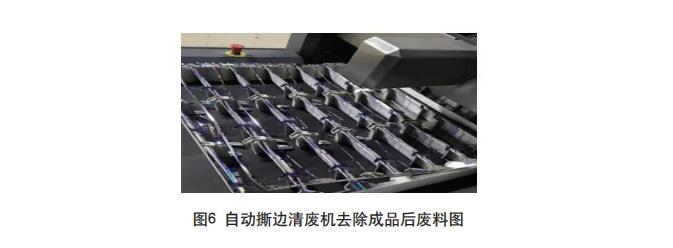 在撕邊工序,改善前的通常情況是印刷紙張模切完以后由人工進行撕邊清廢。但是該產(chǎn)品表面印刷有UV光油,紙張表面較為光滑,不易被抓牢,且由于圖案工藝設計的需要,在每兩個盒片的縱向之間排列有3mm寬的間隔條,在進行人工撕邊清廢時紙張容易脫手,造成產(chǎn)品折損率較高,浪費較大,效率較低,每人每小時只能完成2000張印張的撕邊清廢量,為此我們進行了多次論證分析,決定利用多頭自動撕邊清廢機(如圖6所示),由人工撕邊清廢改為由機器撕邊清廢。