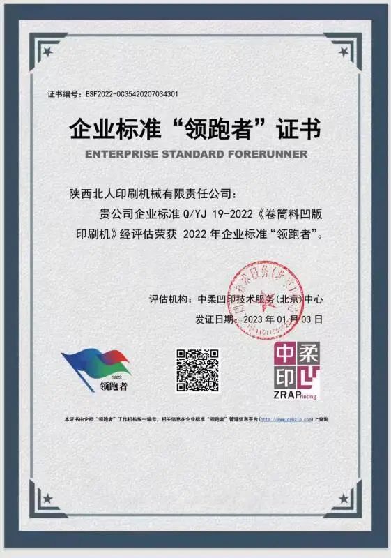 喜訊傳來(lái)!近日,2022年度全國(guó)企業(yè)標(biāo)準(zhǔn)“領(lǐng)跑者”在國(guó)家企業(yè)標(biāo)準(zhǔn)領(lǐng)跑者管理信息平臺(tái)上正式發(fā)布,陜西北人印刷機(jī)械有限責(zé)任公司企業(yè)標(biāo)準(zhǔn)《卷筒料凹版印刷機(jī)》榮獲2022年國(guó)家級(jí)企業(yè)標(biāo)準(zhǔn)“領(lǐng)跑者”證書(shū)。