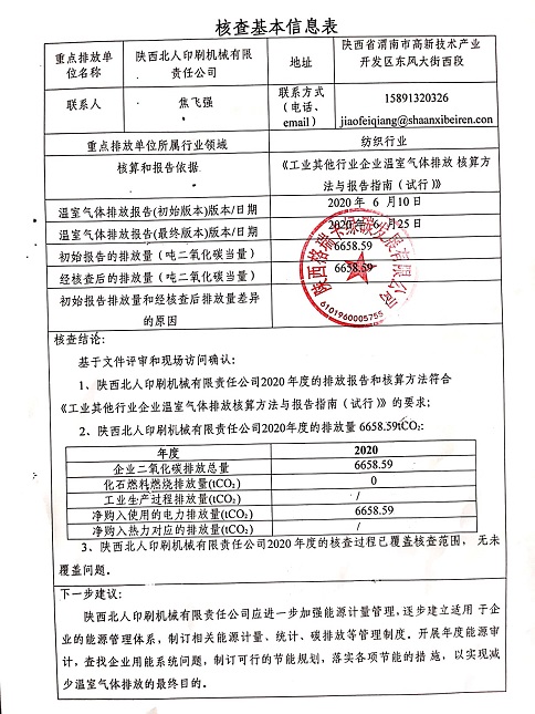 陜西北人印刷機械有限責(zé)任公司建設(shè)綠色工廠,現(xiàn)將第三方《溫室氣體排放核查報告》向社會各界公示,歡迎監(jiān)督。