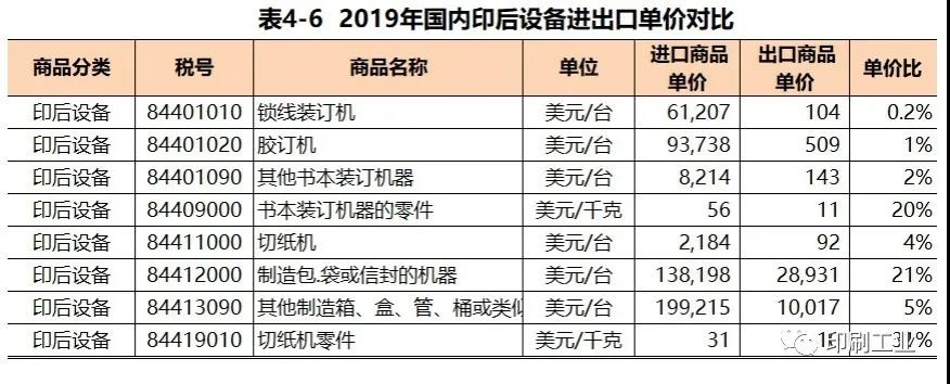 印后設備對比2019年國內印后設備進口1.68億美元。其中,涉及書刊、本冊裝訂的設備及零件進口7406萬美元占印后設備進口總值的44%,而印后包裝類設備(制包、制盒設備)進口4418萬美元占印后設備進口總值的26%、切紙機及零件進口5052萬美元占印后設備進口的30%。作為對比,2019年印后設備出口8.46億美元。其中,涉及書刊、本冊裝訂的設備及零件出口3779萬美元占印后設備出口總值的4%,而印后包裝類設備(制包、制盒設備)出口3.58億美元占印后設備出口總值的42%、切紙機及零件出口4.51億美元占印后設備出口總值的58%。