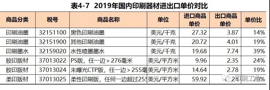 3.印刷器材對比2019年國內印刷器材進口值4.47億美元。其中,涉及印刷油墨、墨水類商品進口4.08億美元占同期印刷器材進口值的92%、印刷版材類商品進口0.38億美元占同期印刷器材進口值的8%。2019年印刷器材出口總值7.81億美元。其中,涉及印刷油墨、墨水類商品出口2.22億美元占同期印刷器材出口值的29%、印刷版材類商品出口5.59億美元占同期印刷器材出口值的71%。無論從商品貿易結構,還是商品貿易規(guī)???,國內印刷器材進口以印刷油墨、墨水類商品為主;印刷器材出口則以印刷版材類商品為主。